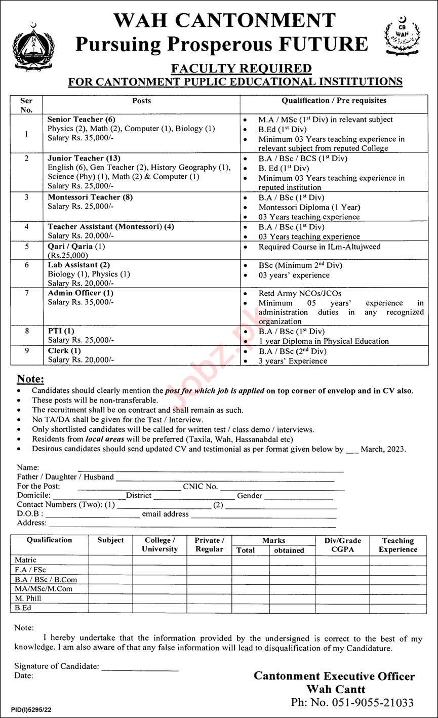 Vacant posts including clerk, physics teacher, qari, biology teacher, english teacher, computer teacher, teacher, science teacher, math teacher, pti, qaria, history teacher, geography teacher, teacher assistant, general teacher, montessori teacher, admin officer and lab assistant are announced in Cantt Public Educational Institution Wah Cantt, wah cantt Punjab Pakistan as per 26 February 2023 advertisement in daily Express Newspaper. Persons with Master, Bachelor, BA, BCS, M.ed, Others, MA and B.ed etc. education can apply.