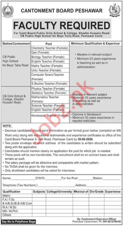 Cantt Board Public Girls School & College Peshawar Jobs 2020