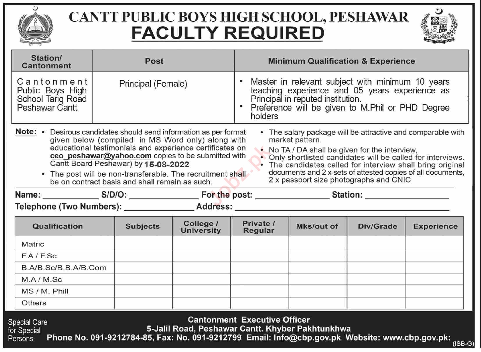 Cantt Public Boys High School, Cantonment Board CB invites applications for job positions advertised in daily Dawn dated 30 July 2022 for following vacancies in Peshawar, peshawar Khyber Pakhtunkhwa KPK Pakistan.