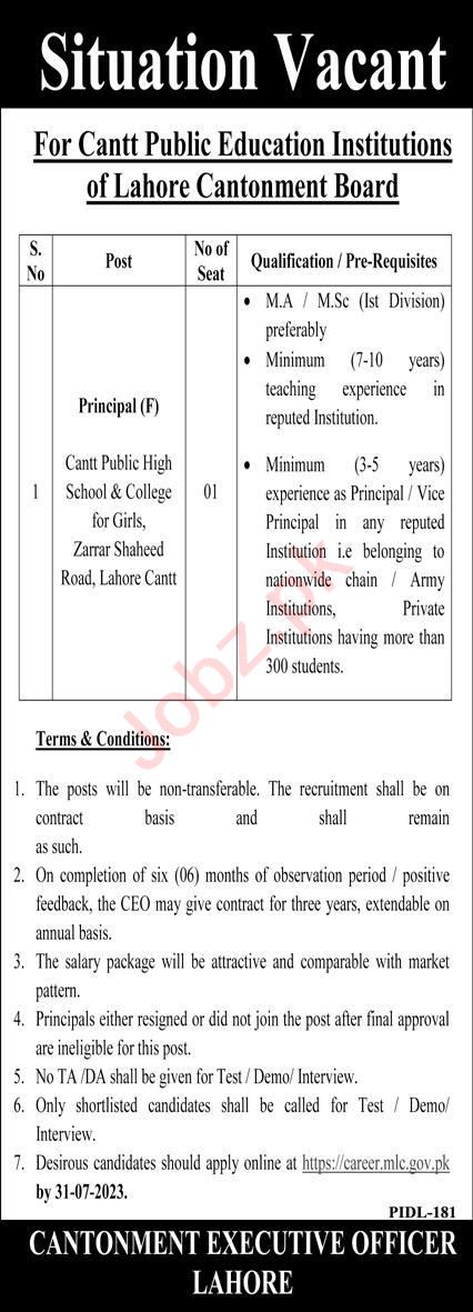 Latest Cantt Public Educational Institution Education Posts Lahore 2025