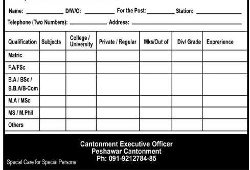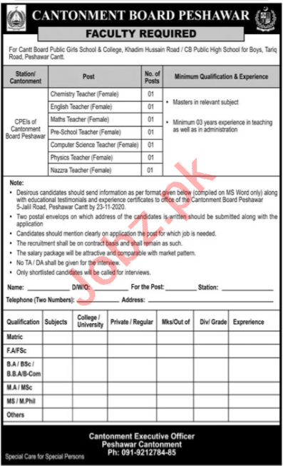 Cantt Board Public Girls School & College Peshawar, Cantonment Board CB, Government of the KPK is looking for the services from experienced candidates for the posts of Teacher, Female Teacher, Chemistry Teacher, English Teacher, Maths Teacher, Pre School Teacher, Computer Science Teacher, Physics Teacher, Nazzra Teacher.