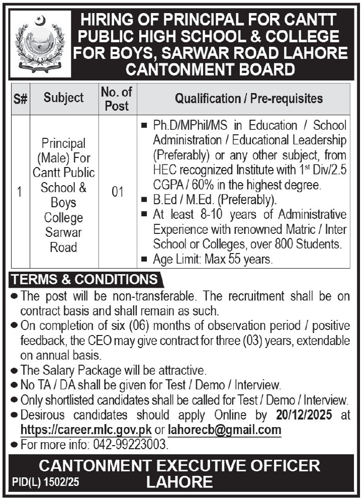 Cantt Public High School latest Government Education jobs and others can be applied till December 20, 2025 or as per closing date in newspaper ad. Read complete ad online to know how to apply on latest Cantt Public High School job opportunities.