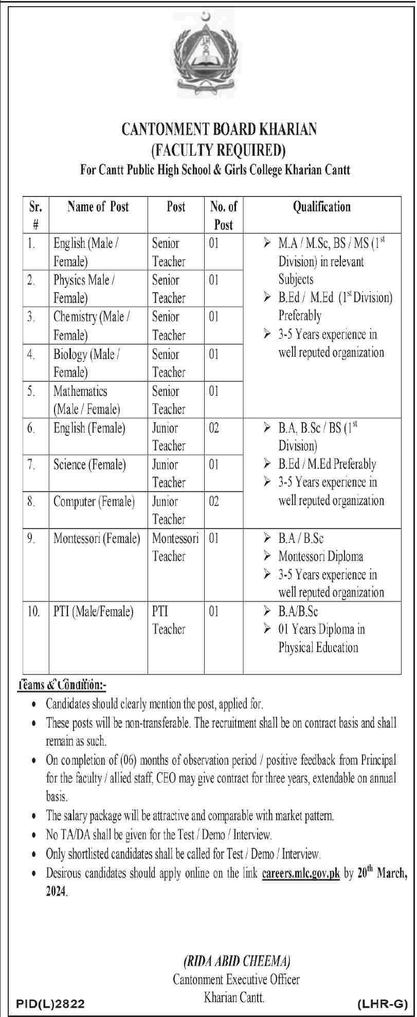 Cantt Public High School and Girls College latest Government Teaching jobs and others can be applied till March 20, 2024 or as per closing date in newspaper ad. Read complete ad online to know how to apply on latest Cantt Public High School and Girls College job opportunities.