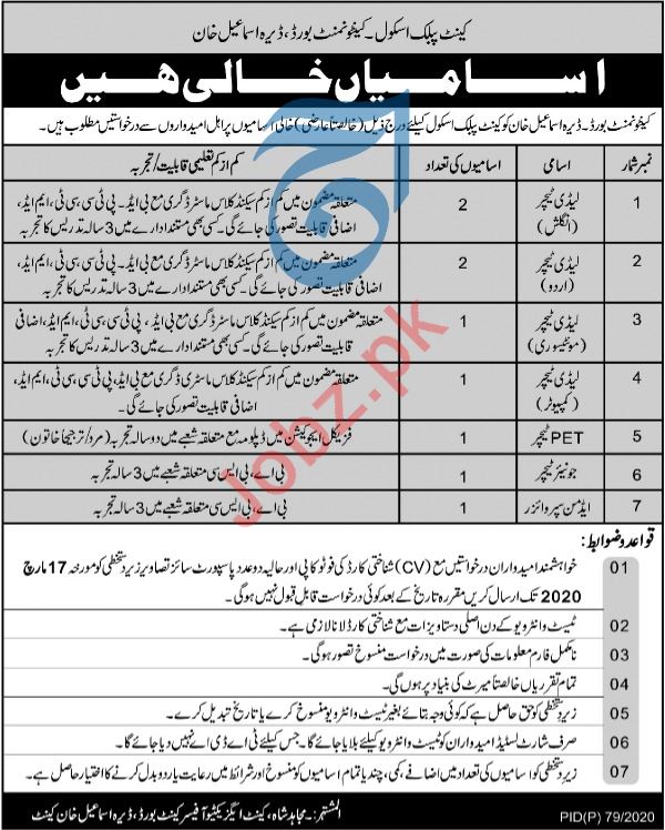 Cantt Public School Jobs 2020 In Dera Ismail DI Khan KPK