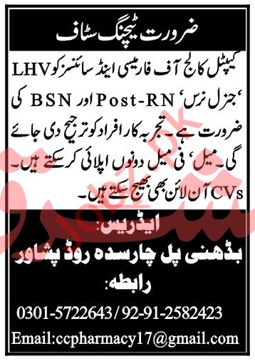 Capital College of Pharmacy CCPHS Peshawar Jobs 2020