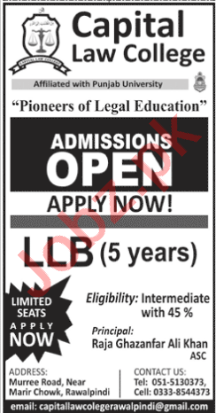 Capital Law College Rawalpindi, Pioneers of Legal Education, Pakistan is announcing admissions fall 2020 for the classes of LLB or Bachelor in Law for Five Years Program . Read newspaper ad for exact details.