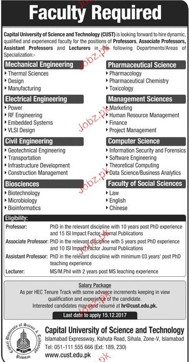 Latest Capital University of Science & Technology Teaching Posts Islamabad 2025