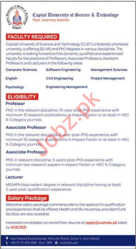 Vacancies in Capital University of Science & Technology Advertisement February 2021