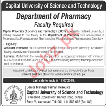 Vacancies in Capital University of Science & Technology CUST Advertisement July 2019