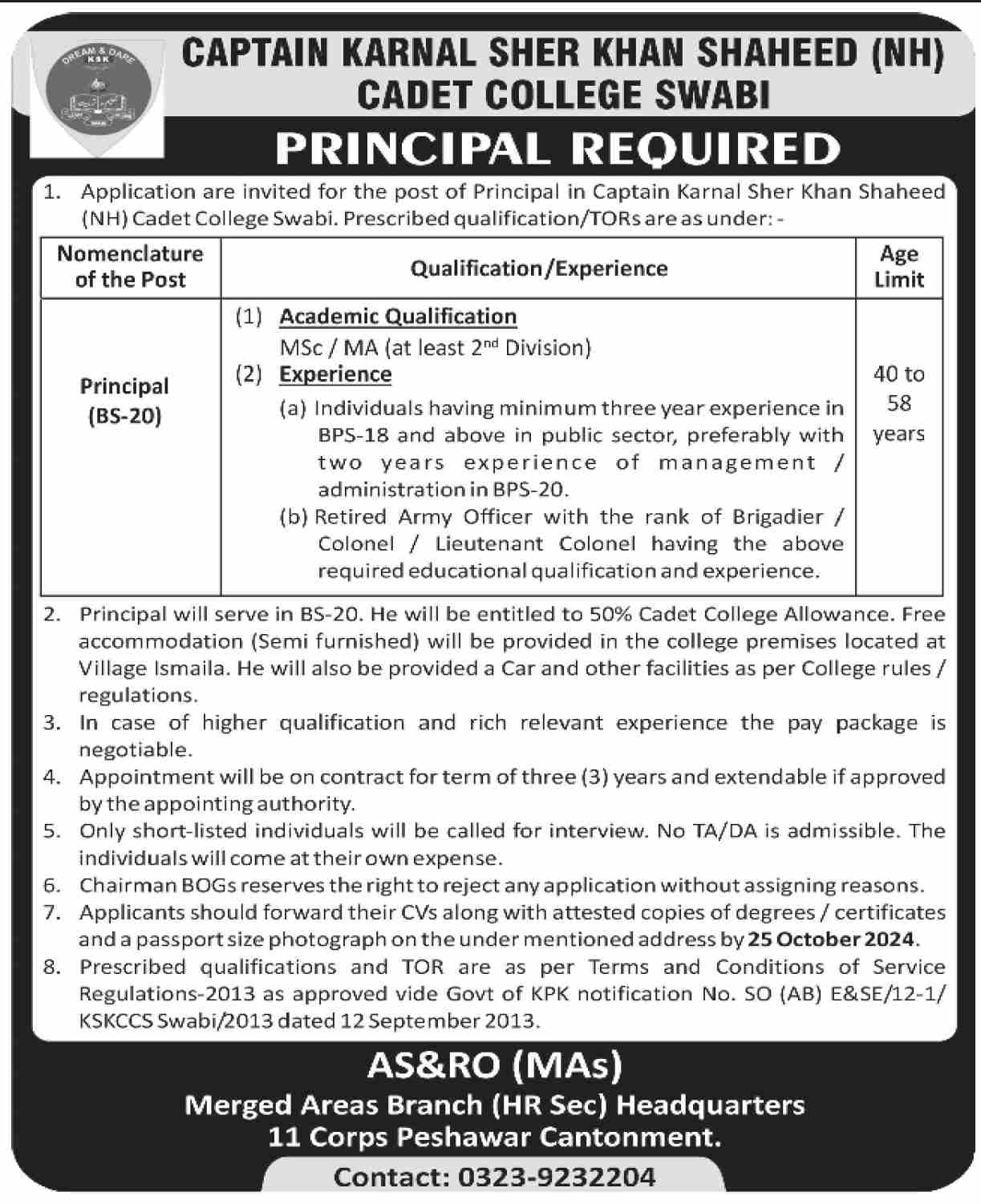 Vacant posts including principal are announced in Karnal Sher Khan Cadet College Swabi Swabi, swabi Khyber Pakhtunkhwa KPK Pakistan as per 10 October 2024 advertisement in daily Dawn Newspaper. Preferred Education is Master, M.sc and MA etc.