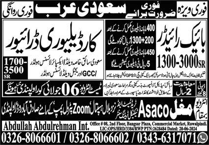 Mughal Asaco Trade Test & Technical Training Center jobs advertisement dated about 5 July 2024 in daily Express Newspaper invites application for the vacant post of car delivery driver, rider, driver, car driver and bike rider in Makkah, dammam Saudi Arabia. Candidates with Matric and Intermediate etc. educational background will be preferred.