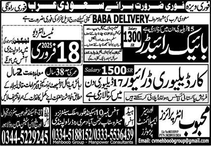 Mehboob Enterprises Overseas Employment Promoters jobs advertisement dated about 8 February 2025 in daily Express Newspaper invites application for the vacant post of car delivery driver, driver and bike rider in Dammam, al khobar Saudi Arabia. Educational qualifications required Matric and Intermediate etc.