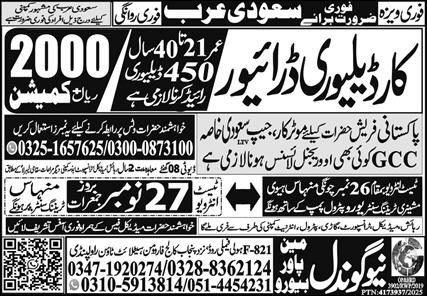 MS New Gondal Manpower Bureau OEP Riyadh, dammam Saudi Arabia invites applications from eligible candidates for the post of car delivery driver, delivery driver, car driver and driver as per advertisement of November 25, 2025 published in daily Express Newspaper. Persons with Matric and Intermediate etc. education can apply.