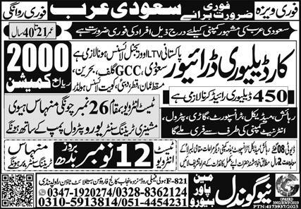 New Gondal Manpower Bureau Riyadh, jeddah Saudi Arabia invites applications from eligible candidates for the post of delivery driver, car delivery driver and driver as per advertisement of November 8, 2025 published in daily Express Newspaper. Persons with Intermediate and Matric etc. education can apply.
