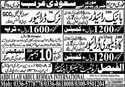 Abdullah Abdul Rehman International jobs advertisement dated about 6 December 2024 in daily Express Newspaper invites application for the vacant post of driver, truck driver, rider, car delivery driver, bike rider and htv driver in Riyadh, jeddah Saudi Arabia. Candidates with Matric and Intermediate etc. educational background will be preferred.