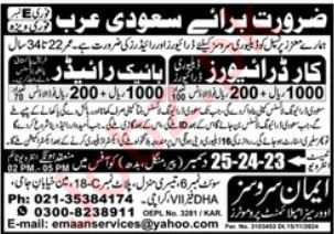 Vacant posts including bike rider and car driver are announced in Emaan Services Saudi Arabia, saudi arabia Saudi Arabia as per 23 December 2024 advertisement in daily Jang Newspaper. Educational qualifications required Intermediate, Matric, Primary and Middle etc.