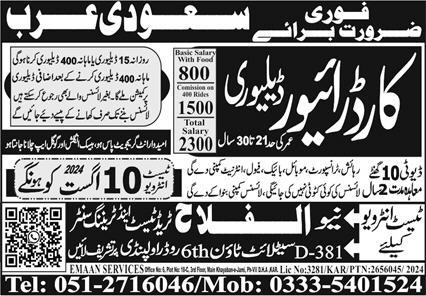 Vacant posts including driver, car driver and car driver delivery are announced in New Al Falah Trade Test & Training Center Jeddah, dammam Saudi Arabia as per 1 August 2024 advertisement in daily Express Newspaper. Matric and Intermediate etc. educational qualification will be preferred.