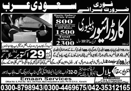 Emaan Services Riyadh, jeddah Saudi Arabia invites applications from eligible candidates for the post of car driver, car driver delivery and driver as per advertisement of October 25, 2024 published in daily Express Newspaper. Matric and Intermediate etc. educational qualification will be preferred.