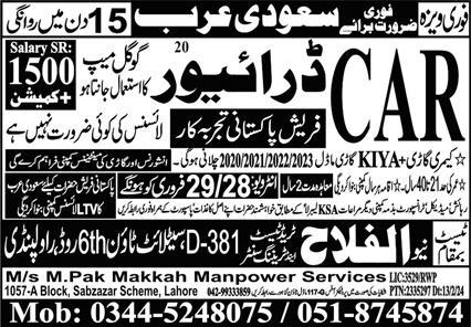 M Pak Makkah Manpower Services latest Overseas Driving jobs and others can be applied till February 29, 2024 or as per closing date in newspaper ad. Read complete ad online to know how to apply on latest M Pak Makkah Manpower Services job opportunities. Learn today extra skills including English (UK), Driving and Car Driving to get these M Pak Makkah Manpower Services jobs. Salary varies from 115000. Overtime is allowed. On job transport, accommodation and medical facility is provided.