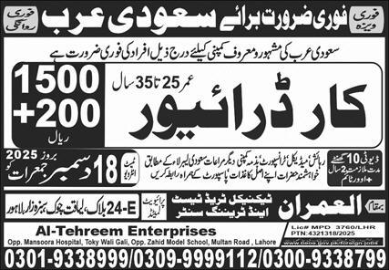 Al Imran Technical Trade Test Center Dammam, dammam Saudi Arabia invites applications from eligible candidates for the post of car drivers as per advertisement of December 14, 2025 published in daily Express Newspaper. Educational qualifications required Matric and Intermediate etc.