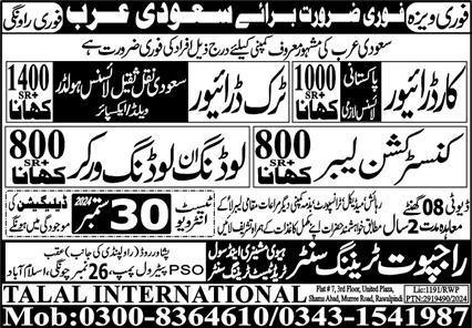 Rajput Training Center jobs advertisement dated about 26 September 2024 in daily Express Newspaper invites application for the vacant post of driver, car driver, construction labor, truck driver and loading unloading worker in Riyadh, jeddah Saudi Arabia. Candidates with Intermediate, Middle and Matric etc. educational background will be preferred.