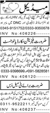 Hospital Clinic invites applications for job positions advertised in daily Aaj dated 19 March 2022 for following vacancies in Peshawar, peshawar Khyber Pakhtunkhwa KPK Pakistan.