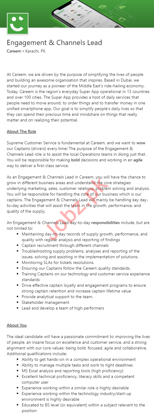 Careem Karachi Jobs 2020 Engagement & Channels Lead
