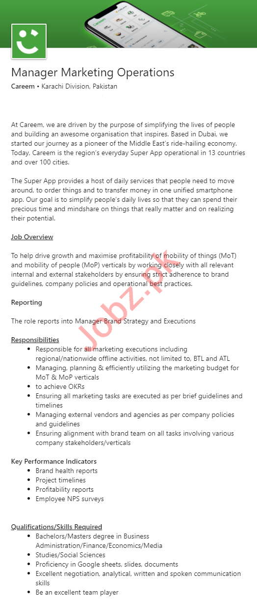 Careem Karachi Jobs 2020 For Manager Marketing Operations