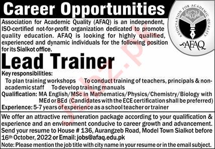 Association for Academic Quality AFAQ invites applications for job positions advertised in daily Express dated 10 October 2022 for following vacancies in Sialkot, sialkot Punjab Pakistan.