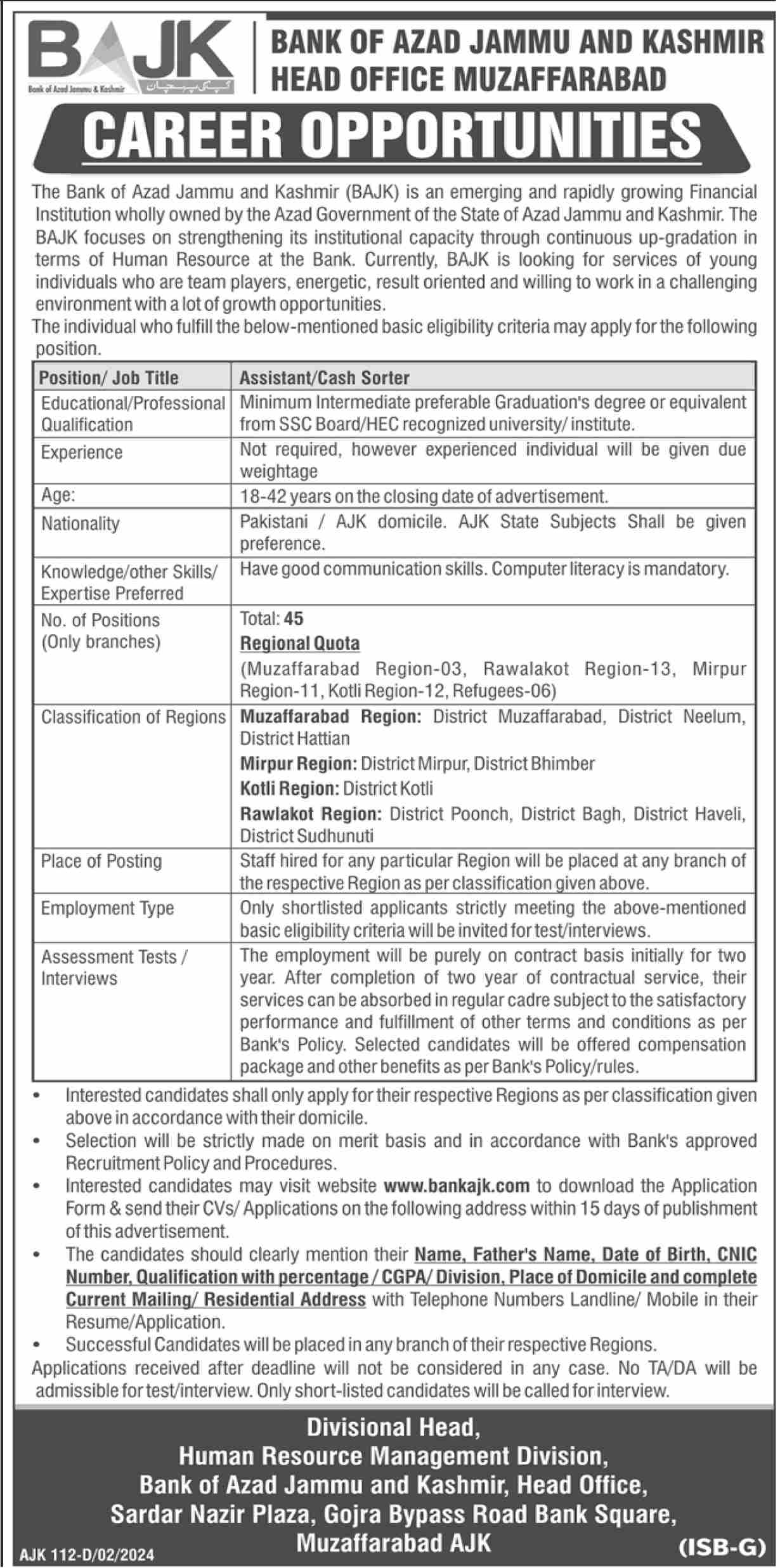 Vacancies in Bank of Azad Jammu & Kashmir Advertisement February 2024