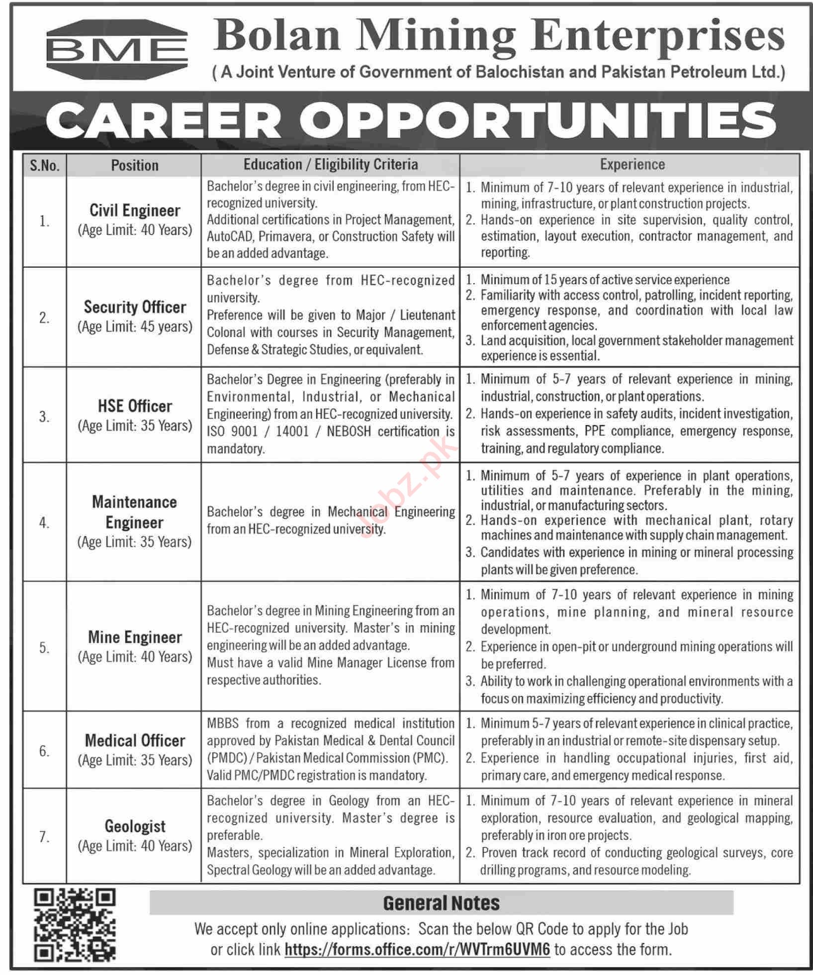 Vacant posts including maintenance engineer, mine engineer, hse officer, medical officer, civil engineer, geologist and security officer are announced in Bolan Mining Enterprises Karachi, karachi Sindh Pakistan as per 20 April 2025 advertisement in daily Dawn Newspaper. Persons with Bachelor, MBBS and Master etc. education can apply.