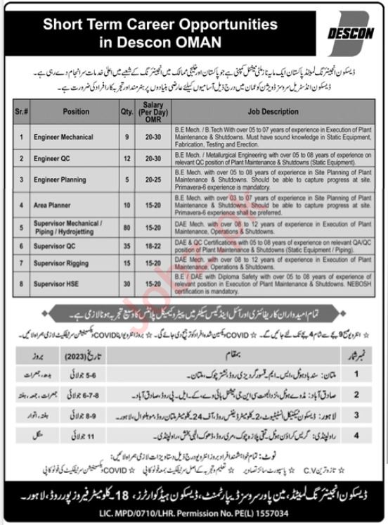 Vacant posts including area planner, engineer planning, engineer mechanical, supervisor qc, supervisor hydrojetting, supervisor rigging, supervisor piping, supervisor mechanical, supervisor hse and engineer qc are announced in Descon Engineering Limited Muscat, muscat Oman as per 2 July 2023 advertisement in daily Jang Newspaper. Preferred Education is Bachelor, DAE and B.E etc.