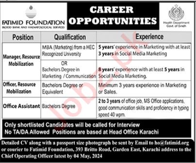 Fatimid Foundation Karachi, karachi Sindh Pakistan invites applications from eligible candidates for the post of office assistant, manager resource mobilization and officer resource mobilization as per advertisement of April 22, 2024 published in daily Jang Newspaper. MBA and Bachelor etc. educational qualification will be preferred.