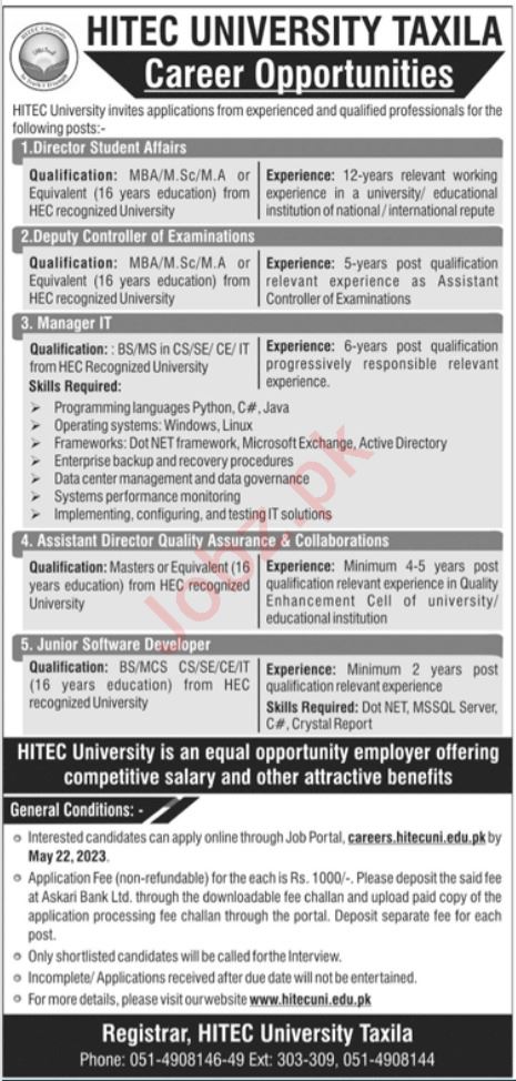 HITEC University is looking for candidates for following posts as per job advertisement published in daily Jang Newspaper of May 7, 2023 for location Taxila, taxila Punjab Pakistan: