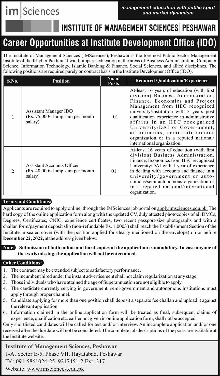 Institute of Management Sciences Peshawar, peshawar Khyber Pakhtunkhwa KPK Pakistan invites applications from eligible candidates for the post of assistant accounts officer and assistant manager ido as per advertisement of December 8, 2022 published in daily Express Newspaper. Educational qualifications required BBA, Bachelor, MBA and Master etc.
