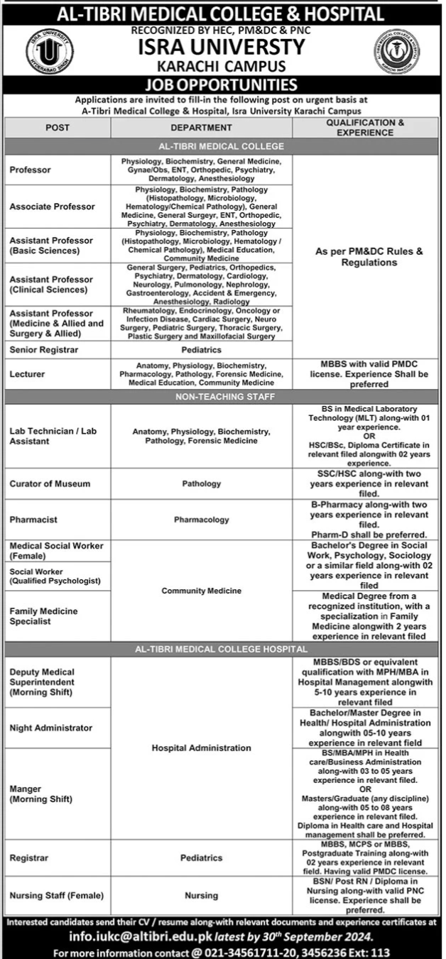 Vacancies in Al Tibri Medical College & Hospital Advertisement September 2024