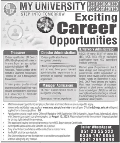 MY University jobs advertisement dated about 31 July 2023 in daily Jang Newspaper invites application for the vacant post of director administration, network administrator, manager admissions, treasurer and it administrator in Islamabad, islamabad Islamabad Pakistan. Persons with Master, Bachelor, MBA, BBA, BIT, MCS, BCS, M.com and MIT etc. education can apply.
