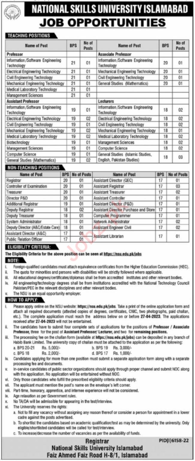 National Skills University Islamabad, islamabad Islamabad Pakistan invites applications from eligible candidates for the post of Assistant Controller, Assistant Director Pd, Assistant Director Ac, Director Pd, System Administrator, Treasurer, Additional Registrar, Registrar, Professor Mechanical Engineering Technology, Associate Professor, Assistant Director Purchase Store, Computer Programmer, Professor Software Engineering Technology, Controller Of Examination, Deputy Registrar, Assistant Librarian, Deputy Director Ac, Public Relation Officer, Lecturer, Network Administrator, Deputy Director Estate Care, Assistant Registrar, Professor Information Technology, Assistant Professor, Deputy Treasurer, Professor Electrical Engineering Technology, Assistant Engineer Civil, Assistant Director Qec, Professor Medical Laboratory Technology, Professor, Professor Management Sciences, Professor Civil Engineering Technology and Assistant Treasurer as per advertisement of April 9, 2023 published in daily Nawaiwaqt Newspaper. Educational qualifications required M.com, MS, Master, Phd, ACCA, M.sc, MBA, Mphil and B.E etc.