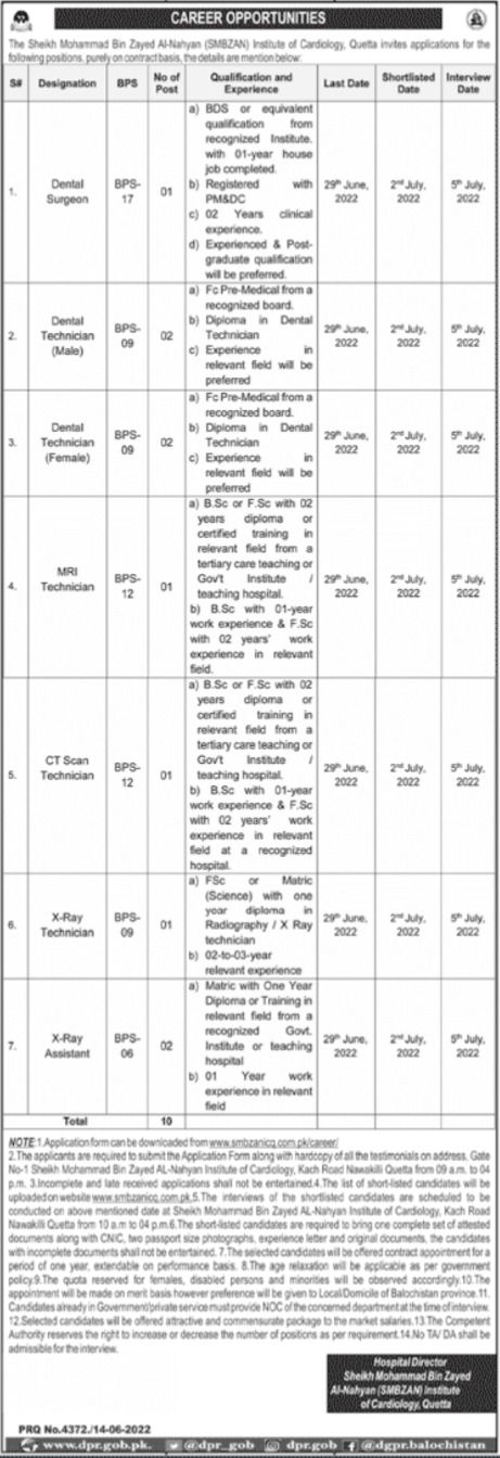 Sheikh Mohammad Bin Zayed Al Nahyan SMBZAN Institute of Cardiology Quetta, quetta Balochistan Pakistan invites applications from eligible candidates for the post of ct scan technician, dental surgeon, xray assistant, male dental technician, xray technician, mri technician and female dental technician as per advertisement of June 15, 2022 published in daily Jang Newspaper. Others, BDS, Matric, Bachelor and Intermediate etc. educational qualification will be preferred.