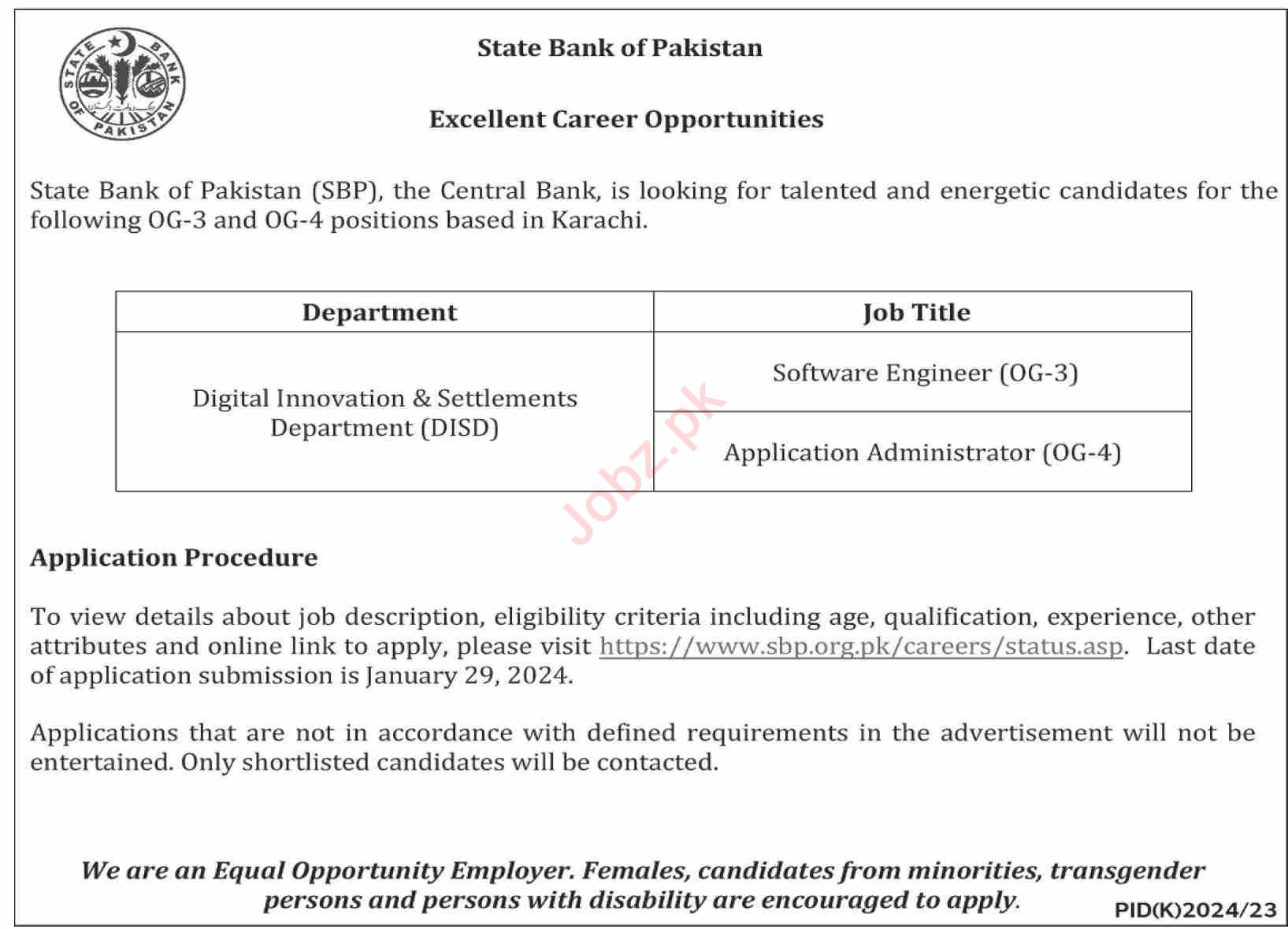 State Bank of Pakistan SBP jobs advertisement dated about 14 January 2024 in daily Dawn Newspaper invites application for the vacant post of software engineer and application administrator in Karachi, karachi Sindh Pakistan. Candidates with Master and Bachelor etc. educational background will be preferred.