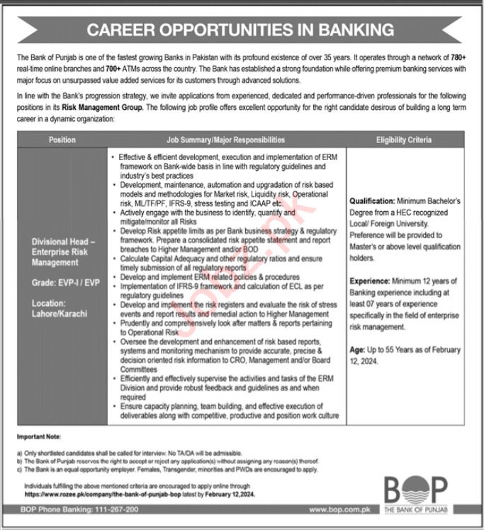 The Bank of Punjab BOP jobs advertisement dated about 28 January 2024 in daily Jang Newspaper invites application for the vacant post of divisional head in Karachi, lahore and karachi Sindh Pakistan. Bachelor etc. educational qualification will be preferred.