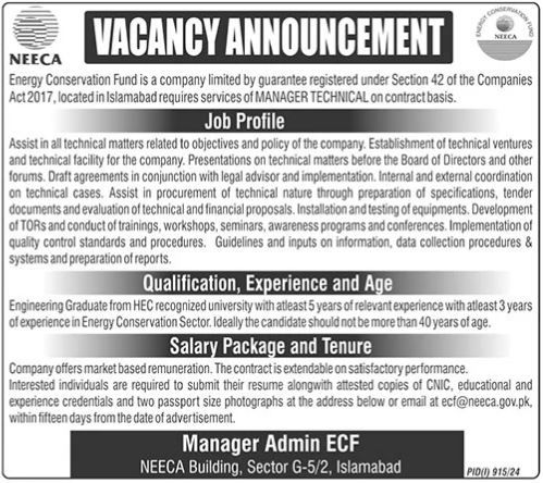 Energy Conservation Fund Islamabad, islamabad Islamabad Pakistan invites applications from eligible candidates for the post of manager technical as per advertisement of August 10, 2024 published in daily The News Newspaper. Candidates with Master and Bachelor etc. educational background will be preferred.