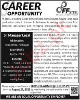 Vacant posts including manager legal are announced in FF Steel Manufacturing Industry Peshawar, peshawar Khyber Pakhtunkhwa KPK Pakistan as per 13 August 2023 advertisement in daily Mashriq Newspaper. Educational qualifications required LLM and LLb etc.