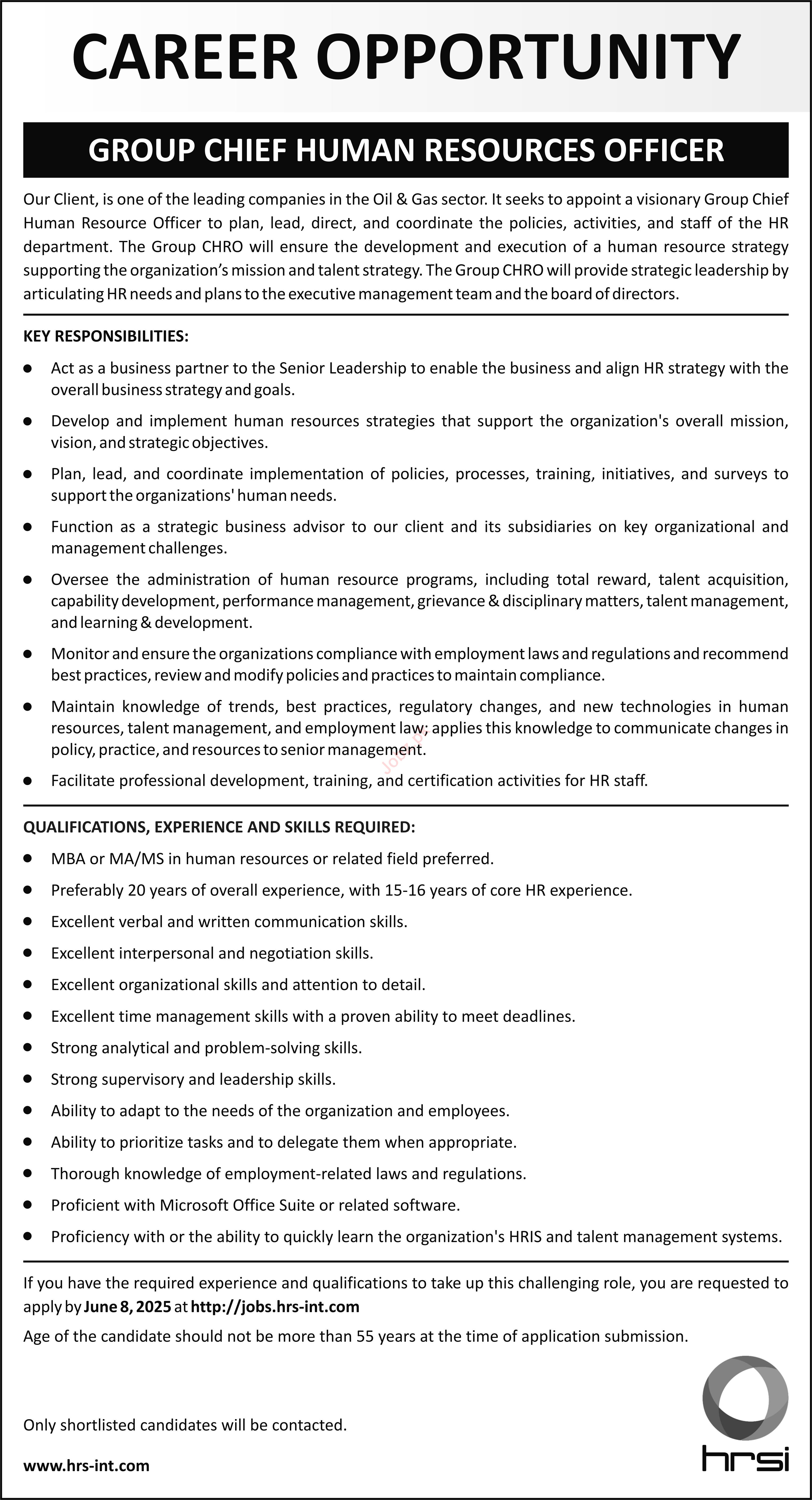 Vacant posts including group chief human resources officer are announced in Human Resource Solution International HRSI Karachi, karachi Sindh Pakistan as per 25 May 2025 advertisement in daily Other Newspaper. Persons with MA, MBA and MS etc. education can apply.