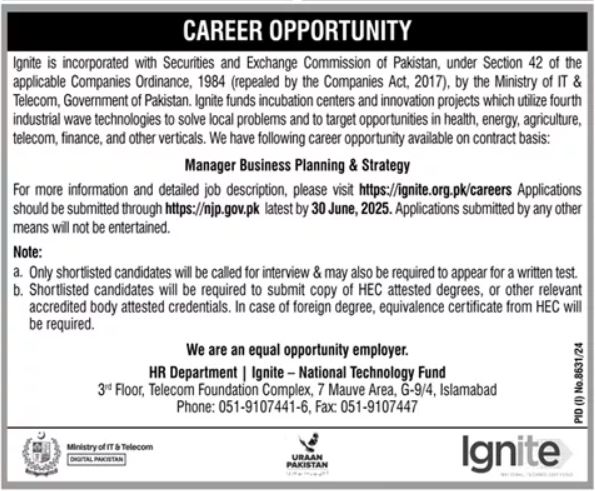 Ignite National Technology Fund invites applications for job positions advertised in daily Dunya dated 14 June 2025 for following vacancies in G-9/4 Islamabad, islamabad Islamabad Pakistan.