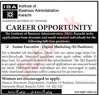 Vacant posts including executive digital marketing are announced in Institute of Business Administration IBA Karachi, karachi Sindh Pakistan as per 8 December 2024 advertisement in daily Express Tribune Newspaper. Persons with Master and Bachelor etc. education can apply.