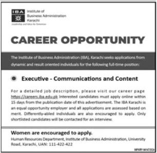 Institute of Business Administration IBA jobs advertisement dated about 31 December 2024 in daily Jang Newspaper invites application for the vacant post of executive communications content in Karachi, karachi Sindh Pakistan. Educational qualifications required Master and Bachelor etc.