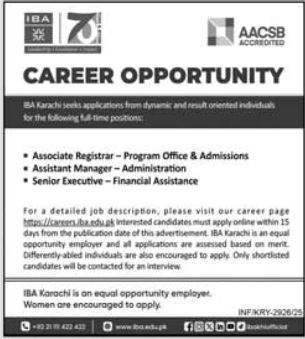 Institute of Business Administration IBA Karachi, karachi Sindh Pakistan invites applications from eligible candidates for the post of sr executive, associate registrar and assistant manager as per advertisement of September 21, 2025 published in daily Jang Newspaper. Persons with MS, Others, Bachelor and Master etc. education can apply.