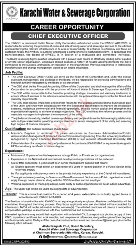 Vacant posts including chief executive officer ceo are announced in Karachi Water & Sewerage Corporation KWSC Karsaz Karachi, karachi Sindh Pakistan as per 18 May 2025 advertisement in daily The News Newspaper. Persons with Master etc. education can apply.