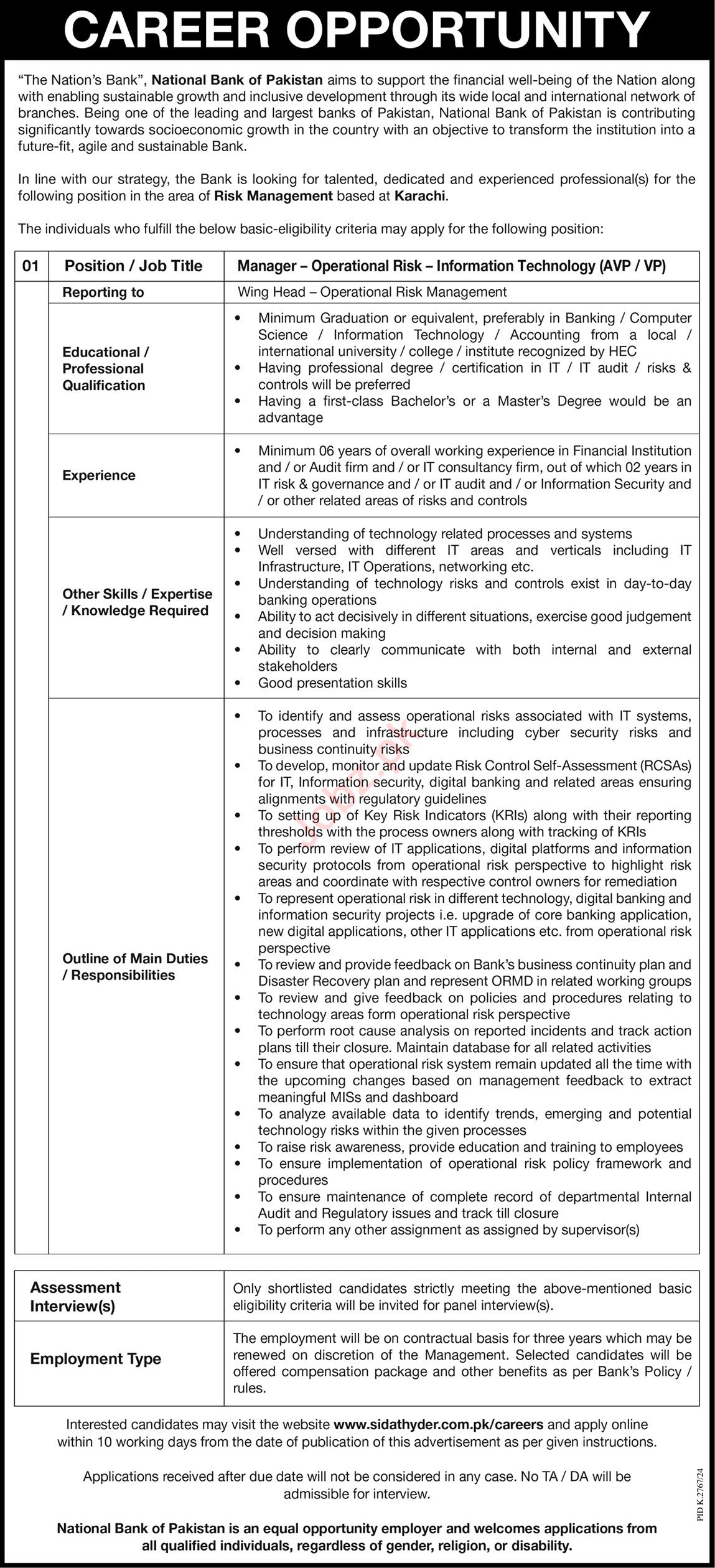 National Bank of Pakistan NBP jobs advertisement dated about 9 March 2025 in daily Other Newspaper invites application for the vacant post of manager operational risk in Karachi, karachi Sindh Pakistan. Persons with Master and Bachelor etc. education can apply.
